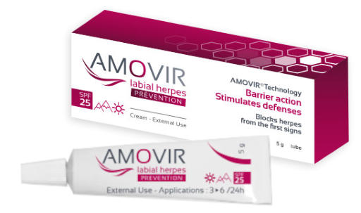 Medical device against herpes labialisThanksto AMOVIR®Technology, AMOVIRherpes labialPreventionisyouressentialallyin preventingtheappearanceofcoldsoresand stopping their development.Thanks to the regular use of AMOVIR herpes labial Prevention, make barrier to herpes and find a daily wellbeing